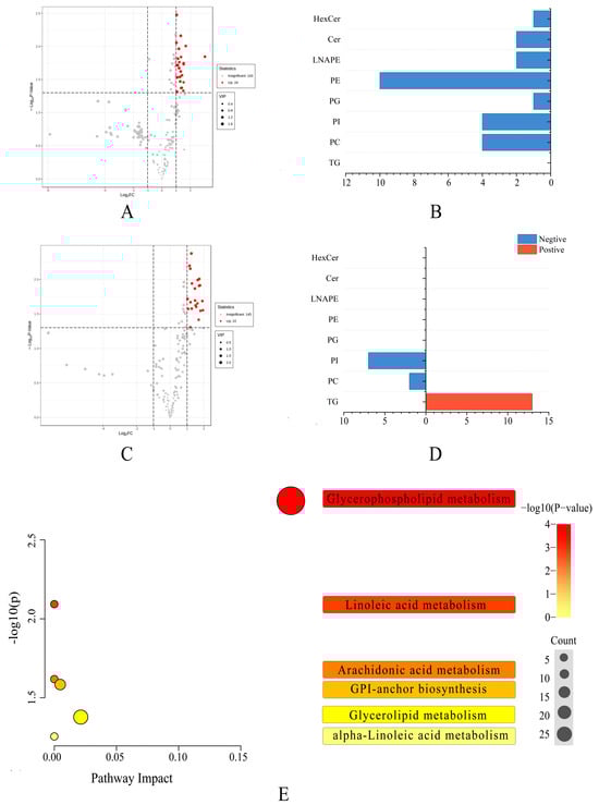 Differential metabolic analysis in response to insect damage. (A) Volcano diagram of the differential metabolites of Type A and Type C. (B) Numbers of the differential metabolites of Type A and Type C under positive and negative modes. (C) Volcano diagram of the differential metabolites of Type B and Type C. (D) Numbers of the differential metabolites of Type B and Type C under positive and negative modes. (E) Pathway impact diagram. The bubble size represents the number of different metabolites involved in this pathway, and the bubble color represents the p-value of this metabolic pathway.