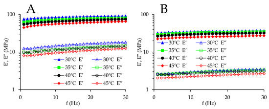 Frequency–temperature superposition predicted values of E′ and E″ for the maize kernel treated by HAVD 75 °C. (A)—E′; (B)—E″.