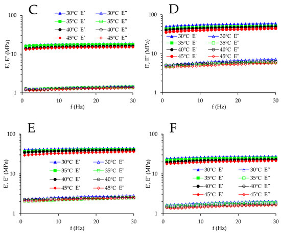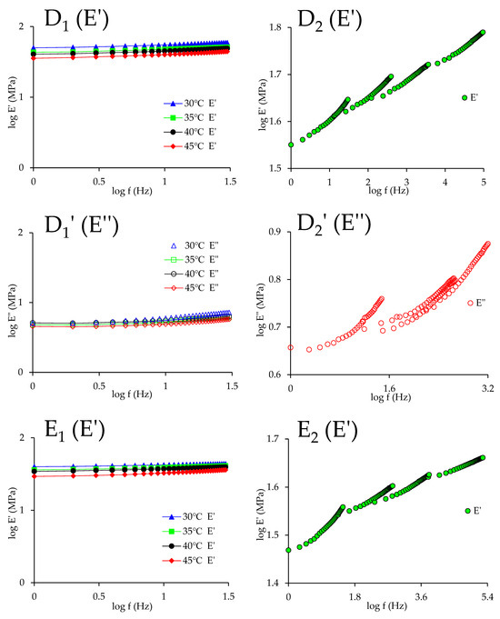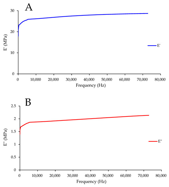 Power law equations (Equations (1) and (2)) were employed to describe the frequency dependence of E′ and E″ [16]: