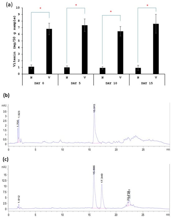 Vitexin content of standard fermented vegetables (N sample) and fermented vegetables with vitexin (V sample) (a) and chromatographic analysis of standard fermented vegetables (b) and fermented vegetables with vitexin (c). Retention time of vitexin is at 15.8 min. * indicates the statistically significant difference between N sample and V sample.