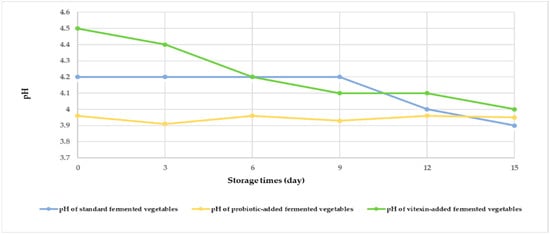 Changes in the pH values of the three fermented vegetable formulas during storage are shown in Figure 2. At the beginning of fermentation, the pH of the three fermented vegetable formulas ranged from 3.90 to 4.50. The pH of the standard fermented vegetables did not change during storage from days 0–9 but decreased on days 12 and 15, while the pH of the probiotic-fermented vegetables also decreased on days 3 and 9. The vitexin-fermented vegetables showed a gradual decrease in pH during the storage period.