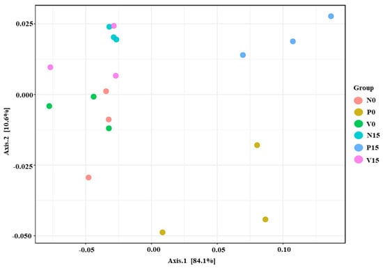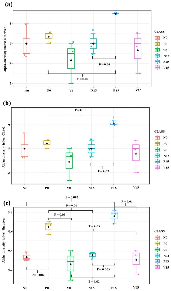 The standard fermented vegetables, probiotic-fermented vegetables, and vitexin-fermented vegetables were examined on days 0 and 15. After quality filtering, 100,797 high-quality sequence reads and 48 OTUs were obtained. Alpha diversity analysis refers to the richness of the microbiome; we analyzed the number of observed species (the number of OTUs), the Chao1 index (the richness), and the Shannon index (the richness and evenness distribution) (Figure 3). The Chao1 index and Shannon index showed the same trend as the number of observed species. We found significant differences in richness between the three formulas of fermented vegetables, including the number of observed species (N15 vs. P15, p value = 0.03; P0 vs. P15; p value = 0.03), Chao1 index (p value = 0.03; N15 vs. P15, P0 vs. P15), and Shannon index (p value = 0.0001; N0 vs. P0, N15 vs. P15, P0 vs. V0, and P15 vs. V15).