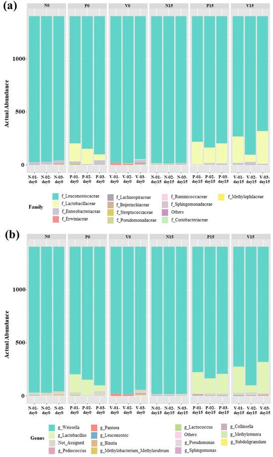 Abundances of bacterial operational taxonomic units (OTUs) at the family (a) and genus (b) levels. Samples are grouped according to the three fermented vegetable formulas (standard fermented vegetables, N group; probiotic-fermented vegetables, P group; vitexin-fermented vegetables, V group) at the storage times of 0 and 15 days.