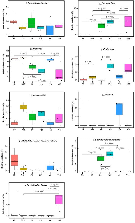 We further analyzed the relative abundance of the OTUs between the three fermented vegetable formulas at different storage times. There were no statistically significant differences between members of the Enterobacteriaceae family or the genera Pantora, Methylobacterium-Methylorubrum, and Leuconostoc, when comparing the six fermented vegetable groups (No, N15, PO, P15, Vo, and V15), as shown in Figure 6. However, significant differences were observed in the genera Pediococcus, Weissella, and Lactobacillus, and the species Lactobacillus rhamnosus and Lactobacillus brevis (all p values < 0.05).
