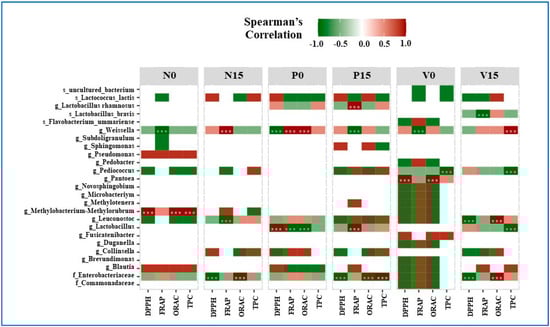 Spearman’s correlation coefficients for bacteria at the amplicon sequencing variant (ASV) level and for three parameters of antioxidant activity and the total phenolic content (DPPH, FRAP, ORAC, and TPC). Significance levels are indicated by asterisks (*** for p value < 0.05). Samples are grouped according to the three fermented vegetable formulas (standard fermented vegetables, N group; probiotic-fermented vegetables, P group; vitexin-fermented vegetables, V group) at days 0 and 15 of storage.