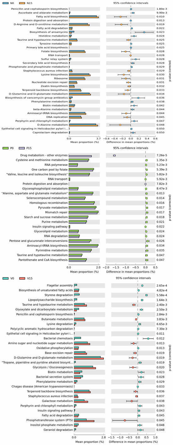 Predicted differential KEGG pathways in between day 0 and day 15 of three formulas of fermented vegetables. The extended error bar plots of significantly differential KEGG pathways were predicted using PICRUSt2 Version 2.5.2 analysis. Bar plots on the left side display the mean proportion of each KEGG pathway. Dot plots on the right show the differences in mean proportions between the two indicated groups using the p value. Only p values < 0.05 (Welch’s test) are shown.