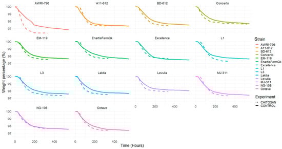 The control groups without chitosan required approximately 500 to 600 h for all studied strains of L. thermotolerans to reach a stationary phase, in which weight loss every 24 h was lower than 0.01%. However, the chitosan-treated trials, for the most part, reached this stage between 300 and 350 h, except for the L. thermotolerans strains Concerto and L3, which required around 500 h (Figure 1). In contrast, the S. cerevisiae control group took 1000 h to complete fermentation, whereas the chitosan-treated S. cerevisiae group reached the stationary stage in 350 h. These findings suggest that chitosan consistently accelerated the fermentation kinetics in all cases. This effect could be beneficial in mitigating the risk of sluggish alcoholic fermentation, although it should be noted that faster kinetics may require additional cooling measures at an industrial scale.