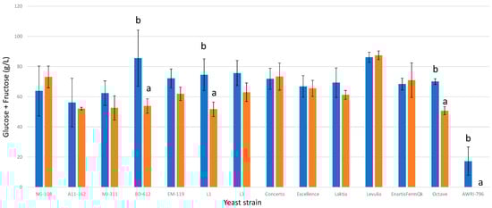 The final glucose + fructose concentrations (g/L) of the final wines fermented by the examined yeast strains are illustrated, indicating their fermentation in chitosan-free SGM (blue) and chitosan-enriched SGM (orange). Distinct letters are used to indicate statistically significant differences at a significance level of p = 0.05.