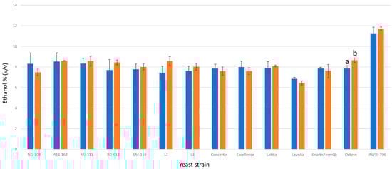 The final ethanol concentration percentages (v/v) of the final wines fermented by the examined yeast strains are illustrated, indicating their fermentation in chitosan-free SGM (blue) and chitosan-enriched SGM (orange). Distinct letters are used to indicate statistically significant differences at a significance level of p = 0.05.