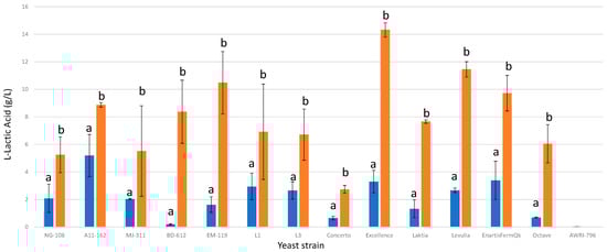 The final L-lactic acid concentrations (g/L) of the final wines fermented by the examined yeast strains are illustrated, indicating their fermentation in chitosan-free SGM (blue) and chitosan-enriched SGM (orange). Distinct letters are used to indicate statistically significant differences at a significance level of p = 0.05.