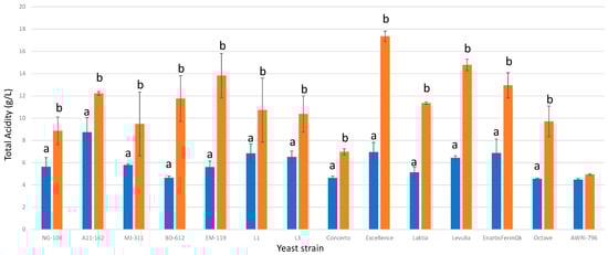 The final total acidity concentrations (g/L) of the final wines fermented by the examined yeast strains are illustrated, indicating their fermentation in chitosan-free SGM (blue) and chitosan-enriched SGM (orange). Distinct letters are used to indicate statistically significant differences at a significance level of p = 0.05.