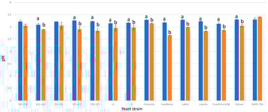 The final pH values of the final wines fermented by the examined yeast strains are illustrated, indicating their fermentation in chitosan-free SGM (blue) and chitosan-enriched SGM (orange). Distinct letters are used to indicate statistically significant differences at a significance level of p = 0.05.
