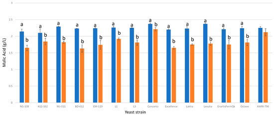 The final L-malic acid concentrations (g/L) of the final wines fermented by the examined yeast strains are illustrated, indicating their fermentation in chitosan-free SGM (blue) and chitosan-enriched SGM (orange). Distinct letters are used to indicate statistically significant differences at a significance level of p = 0.05.