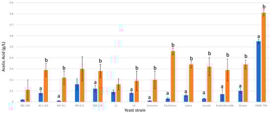 The final acetic acid concentrations (g/L) of the final wines fermented by the examined yeast strains are illustrated, indicating their fermentation in chitosan-free SGM (blue) and chitosan-enriched SGM (orange). Distinct letters are used to indicate statistically significant differences at a significance level of p = 0.05.