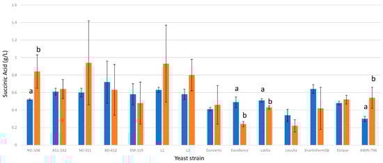 The importance of yeast strain selection has gained prominence in recent years due to the association of succinic acid with the sensory descriptor of minerality, a distinctive parameter in certain wines [10]. S. cerevisiae exhibits strain variability in succinic acid production, ranging from 0.5 g/L to 1.8 g/L (Figure 9). The average values of succinic acid concentrations in the regular control groups without chitosan varied from 0.34 g/L to 0.72 g/L, while in the fermentations enriched with chitosan, the values ranged from 0.22 g/L to 0.94 g/L for the studied L. thermotolerans strains. However, only three out of the thirteen L. thermotolerans strains displayed statistically significant differences. One strain demonstrated a higher final concentration of succinic acid (strain NG-108), with an increase of 0.32 g/L compared to the regular control without chitosan, while two strains exhibited reduced final concentrations (strains Excellence and Laktia), with decreases of 0.25 g/L and 0.08 g/L, respectively. Under the influence of chitosan, the S. cerevisiae control group exhibited an increase of 0.24 g/L in the final concentration of succinic acid. These findings suggest that only a limited number of strains demonstrate a notable impact on succinic acid production under the influence of chitosan.