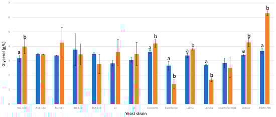 The final glycerol concentrations (g/L) of the final wines fermented by the examined yeast strains are illustrated, indicating their fermentation in chitosan-free SGM (blue) and chitosan-enriched SGM (orange). Distinct letters are used to indicate statistically significant differences at a significance level of p = 0.05.