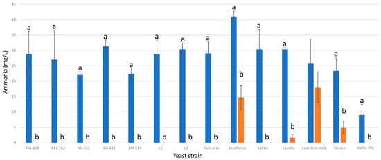 The final ammonia concentrations (mg/L) of the final wines fermented by the examined yeast strains are illustrated, indicating their fermentation in chitosan-free SGM (blue) and chitosan-enriched SGM (orange). Distinct letters are used to indicate statistically significant differences at a significance level of p = 0.05.