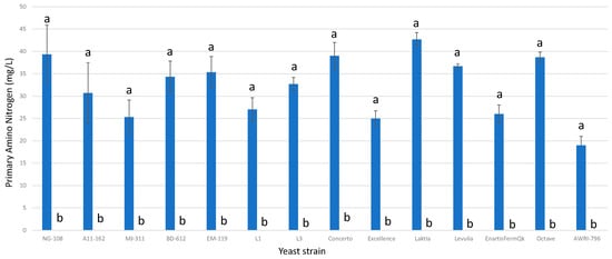 Chitosan exerted a significant influence on ammonia consumption for twelve out of the thirteen studied strains of L. thermotolerans (Figure 11). The control groups without chitosan displayed final ammonia concentrations ranging from 22 mg/L to 41 mg/L, while fermentations enriched with chitosan predominantly resulted in final concentrations of 0 mg/L for most strains (NG-108, A11-612, MJ-311, BD-612, EM-119, L1, L3, Concerto, and Laktia). Strain Excellence exhibited a final ammonia concentration 64% lower than the control without chitosan, while Levulia and Concerto showed reductions of 95% and 79%, respectively. The only L. thermotolerans strain that did not display significant differences between the control and the chitosan-treated version was strain EnartisFermQK. This finding highlights the importance of considering nutrient deficiencies when utilizing chitosan, as it may lead to undesired situations of nutrient shortage, potentially affecting the performance of more fermentative yeasts, like S. cerevisiae, which typically concludes the alcoholic fermentation process in sequential combinations with L. thermotolerans at an industrial scale. To mitigate these potential issues, a second addition of nutrients during the alcoholic fermentation process could be implemented [8].
