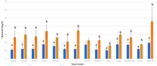 The final i-butanol concentrations (mg/L) of the final wines fermented by the examined yeast strains are illustrated, indicating their fermentation in chitosan-free SGM (blue) and chitosan-enriched SGM (orange). Distinct letters are used to indicate statistically significant differences at a significance level of p = 0.05.