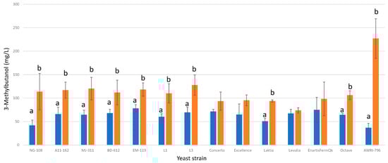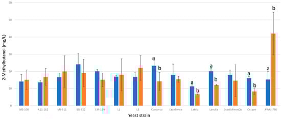 The final 2-methylbutanol concentrations (mg/L) of the final wines fermented by the examined yeast strains are illustrated, indicating their fermentation in chitosan-free SGM (blue) and chitosan-enriched SGM (orange). Distinct letters are used to indicate statistically significant differences at a significance level of p = 0.05.