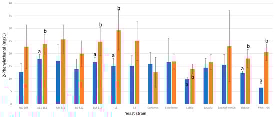 The final 2-phenylethanol concentrations (mg/L) of the final wines fermented by the examined yeast strains are illustrated, indicating their fermentation in chitosan-free SGM (blue) and chitosan-enriched SGM (orange). Distinct letters are used to indicate statistically significant differences at a significance level of p = 0.05.