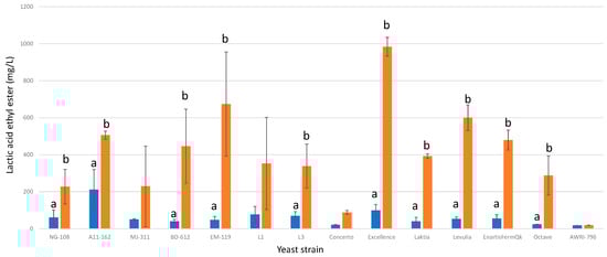 The final lactic acid ethyl ester concentrations (mg/L) of the final wines fermented by the examined yeast strains are illustrated, indicating their fermentation in chitosan-free SGM (blue) and chitosan-enriched SGM (orange). Distinct letters are used to indicate statistically significant differences at a significance level of p = 0.05.