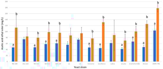 The final acetic acid ethyl ester concentrations (mg/L) of the final wines fermented by the examined yeast strains are illustrated, indicating their fermentation in chitosan-free SGM (blue) and chitosan-enriched SGM (orange). Distinct letters are used to indicate statistically significant differences at a significance level of p = 0.05.