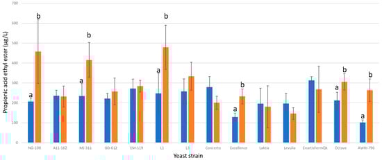 The final propionic acid ethyl ester concentrations (µg/L) of the final wines fermented by the examined yeast strains are illustrated, indicating their fermentation in chitosan-free SGM (blue) and chitosan-enriched SGM (orange). Distinct letters are used to indicate statistically significant differences at a significance level of p = 0.05.