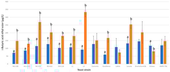 The final i-butyric acid ethyl ester concentrations (µg/L) of the final wines fermented by the examined yeast strains are illustrated, indicating their fermentation in chitosan-free SGM (blue) and chitosan-enriched SGM (orange). Distinct letters are used to indicate statistically significant differences at a significance level of p = 0.05.