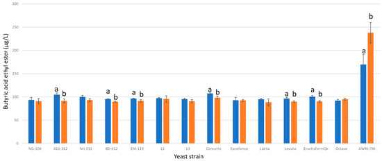The final butyric acid ethyl ester concentrations (µg/L) of the final wines fermented by the examined yeast strains are illustrated, indicating their fermentation in chitosan-free SGM (blue) and chitosan-enriched SGM (orange). Distinct letters are used to indicate statistically significant differences at a significance level of p = 0.05.
