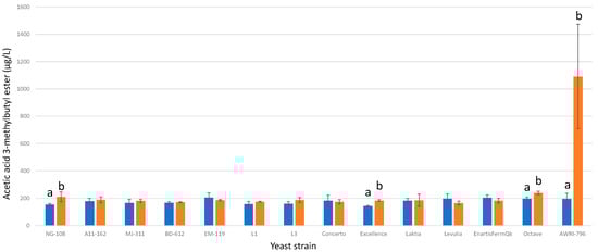 The final acetic acid 3-methylbutyl ester concentrations (µg/L) of the final wines fermented by the examined yeast strains are illustrated, indicating their fermentation in chitosan-free SGM (blue) and chitosan-enriched SGM (orange). Distinct letters are used to indicate statistically significant differences at a significance level of p = 0.05.