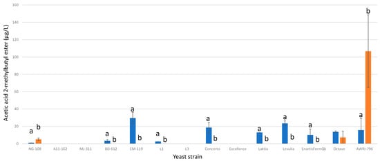 The final acetic acid 2-methylbutyl ester concentrations (µg/L) of the final wines fermented by the examined yeast strains are illustrated, indicating their fermentation in chitosan-free SGM (blue) and chitosan-enriched SGM (orange). Distinct letters are used to indicate statistically significant differences at a significance level of p = 0.05.