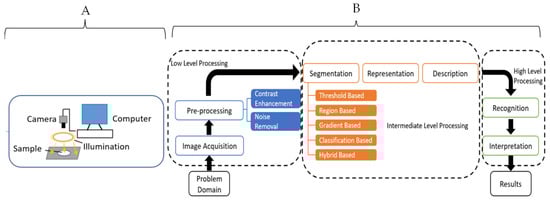 Figure 6. Schematic diagrams for a typical computer vision system (A) and data analysis steps (B) [71]. Copyright by Elsevier.
