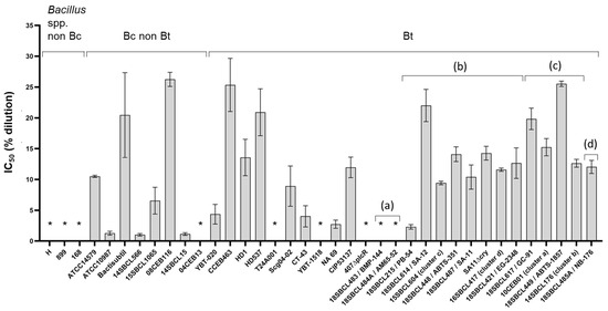 - Schwenk, V.; Riegg, J.; Lacroix, M.; Martlbauer, E.; Jessberger, N. Enteropathogenic Potential of Bacillus thuringiensis Isolates from Soil, Animals, Food and Biopesticides. Foods 2020, 9, 1484. [Google Scholar] [CrossRef] [PubMed]