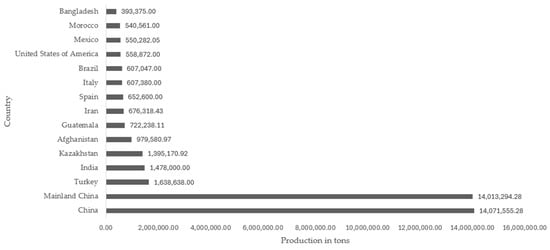 A popular fruit known as rock melon is currently seeking a new use for its skin, which has no economic value and is discarded as refuse []. The epidermis of the cantaloupe melon is net-like, gray-to-green, or light brown, and faintly ribbed. It is one of the most widely consumed cucurbits in the world due to its richness, juiciness, pleasant flavor, and nutritional value []. The Cucumis melo L. var. cantalupensis cultivar has a world production of 42.6 million tons, and the country with the highest production was China with 14.07 million tons. The commercial value of cantaloupe and other varieties of melon produced worldwide was 12.80 million dollars in 2021, according to data from FAOSTAT []. The countries with the highest production of cantaloupe and other varieties of melon worldwide are illustrated in Figure 1.