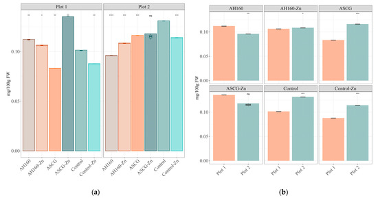 Finally, differences between the two plots were studied for each cucumber group (Figure 1b). Statistically significant differences were found for all groups except for the ASCG-Zn group. Cucumbers from plot 2 had more Zn (p < 0.05) than those from plot 1 for the AH160-Zn, ASCGs, control and control-Zn groups, while the opposite was found for the AH160 group.
