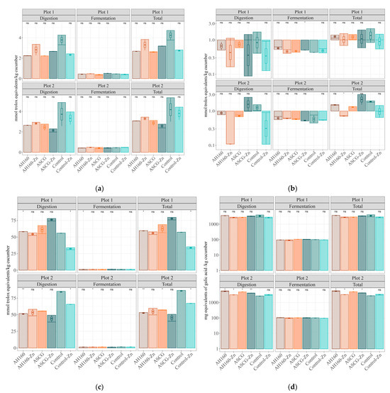 In the case of the DPPH method (Figure 2b), comparing all groups with respect to the control, statistically significant differences (p < 0.05) were found in the in vitro fermentation fraction for samples from plot 1, where ASCG-Zn cucumbers showed higher antioxidant capacity than those of the control group. In plot 2, statistically significant differences were found for total antioxidant capacity, where ASCGs and AH160-Zn cucumbers showed significantly (p < 0.05) lower antioxidant capacity than the control group. When studying the comparisons between the different groups (Table 2) there were no significant differences in their antioxidant capacity.