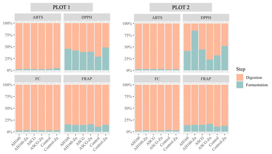 Figure 3 depicts the antioxidant capacity of both fractions obtained after in vitro digestion and fermentation. In general, the antioxidant capacity after in vitro fermentation decreased considerably compared to that obtained after in vitro digestion. This occurred for both ABTS and FC methods and in both plots. For the FRAP method, the fraction belonging to in vitro fermentation did not reach 25% for any of the treated groups of cucumbers, nor for any of the plots. In the case of the DPPH method, it was observed that the contribution to the total antioxidant capacity of the in vitro fermentation fraction was higher than for the other methods, although none of the treated cucumber groups reached 50% for plot 1; in addition, the AH160-Fe group exceeded 75% in plot 2. Therefore, in vitro digestion contributes more to the release of total antioxidant capacity.