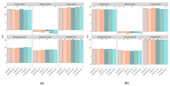SCFAs produced after in vitro fermentation of cucumbers. (a) Plot 1. (b) Plot 2. Results were log10 transformed to improve visualization. Statistical analysis performed using Student’s t test (control group as reference). Statistical labels: *: p < 0.05, **: p < 0.01, ***: p < 0.001, ****: p < 0.0001, ns: not significant.