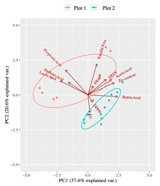 In order to study the significance of the different variables studied in both plots, a principal component analysis was performed (Figure 5). Since the variables included in the analysis where very different (Zn content, antioxidant capacity and SCFAs) the variability explained for both plots was not very high (total 58.2%, 37.6 for PC1 and 20.6 for PC2). The samples from plot 1 showed higher contributions to the explained variability of lactic, succinic, propionic and acetic acids, total SCFAs, ABTS and FRAP. In the case of plot 2, DPPH, FC and butyric acid showed high contributions. It is well known that soil structure affects plant growth in many ways. The uptake of water and nutrients by plants can be limited by inadequate contact with the solid and liquid phases of the soil [28]. This could explain why such differences in soil could have a direct impact on the nutritional properties of cucumbers.