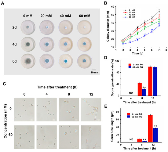 Inhibition of FG on the growth of P. expansum in vitro. (A) Growth state of P. expansum on PDA medium with different concentrations of FG. Bar = 20 mm. (B) Statistics of colony diameter. (C) Microscopic observation of P. expansum spore germination status. Bar = 20 μm. (D) Statistics of spore germination rate. (E) Statistics of germ tube length. Values in (B,D,E) are means ± SD (n = 6), analyzed using Student’s t-test, * p < 0.05, ** p < 0.01. ND means no data.