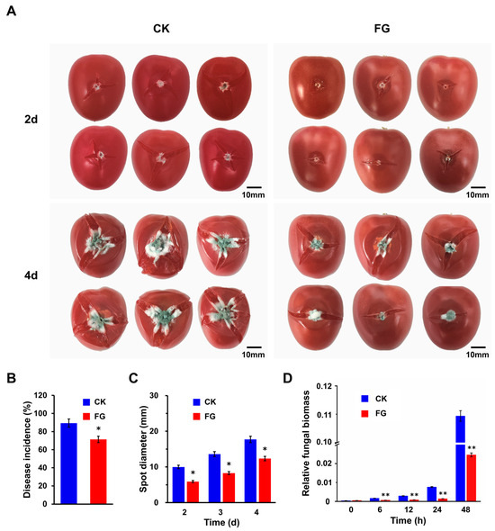 Inhibition of FG against Penicillium rot of tomato fruit. (A) Cherry tomato fruits after inoculation with P. expansum spores. Bar = 10 mm. (B) Statistics of disease incidence. (C) Statistics of spot diameter on tomatoes. (D) Relative fungal biomass. The growth of P. expansum was quantified using qPCR [2[CT (SlActin) − CT (18Sr)]]. FG: the FG-treated group; CK: the control check group. Values in (B,C) are means ± SD (n = 100), values in (D) are means ± SD (n = 3), analyzed using Student’s t-test, * p < 0.05, ** p < 0.01.