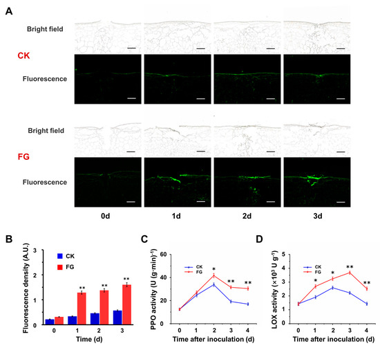 Promotion of FG on the accumulation of suberin. (A) Autofluorescence of suberin polyphenolics (SPPs) at the inoculation site of tomatoes. Spontaneous fluorescence of SPPs at 488 nm excitation wavelength, bar = 500 μm. (B) ImageJ quantitative mean fluorescence density. (C) Polyphenol oxidase (PPO) activity. (D) Lipoxygenase (LOX) activity. FG: the FG–treated group; CK: the control check group. Values in (B–D) are means ± SD (n = 3), analyzed using Student’s t–test, * p < 0.05, ** p < 0.01.
