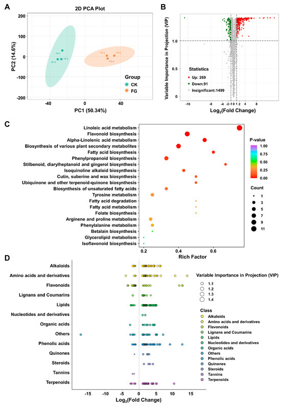 To substantiate the beneficial effects of FG on suberin accumulation, an in-depth analysis of metabolite patterns induced by FG was conducted. Metabolites were extracted from fruits inoculated with P. expansum spores from the CK and FG groups after 30 h and were, subsequently, analyzed using UPLC–MS/MS. The metabolite profiles of samples were then subjected to principal component analysis (PCA). The score plots of PCA exhibited two principal components (PC1 and PC2), accounting for 50.34% and 14.64%, respectively. The PC1 value indicated discriminative metabolic levels between the FG sample and the CK groups (Figure 4A). By setting the threshold for significantly differential metabolites (DMs) screening at variable importance in projection (VIP) > 1.0 and a p-value < 0.05, a total of 360 DMs were obtained, of which 269 DMs were significantly upregulated and 91 DMs were significantly downregulated, respectively (Figure 4B).
