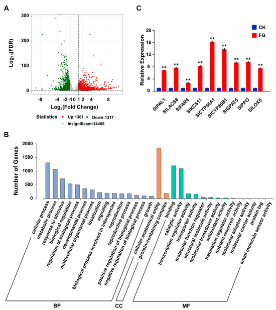 The effect of FG on the expression of genes related to suberization. (A) Volcano plot of differential genes. The x-axis represents the fold change in gene expression, while the y-axis indicates the significance level of differential genes. Red, green, and gray dots represent upregulated, downregulated, and non-differentially expressed genes, respectively. (B) qRT-PCR analysis of critical genes involved in regulating the biosynthesis of suberin. SlUBI3 (Solyc01g056940) was regarded as the internal control. FG: the FG-treated group; CK: the control check group. Values are means ± SD (n = 3), analyzed using Student’s t-test, ** p < 0.01. (C) GO functional enrichment analysis. GO is divided into three parts, as follows: biological processes (BPs), cellular components (CCs), and molecular functions (MFs). The x-axis represents the secondary GO terms, while the y-axis indicates the number of differential genes in each GO term.