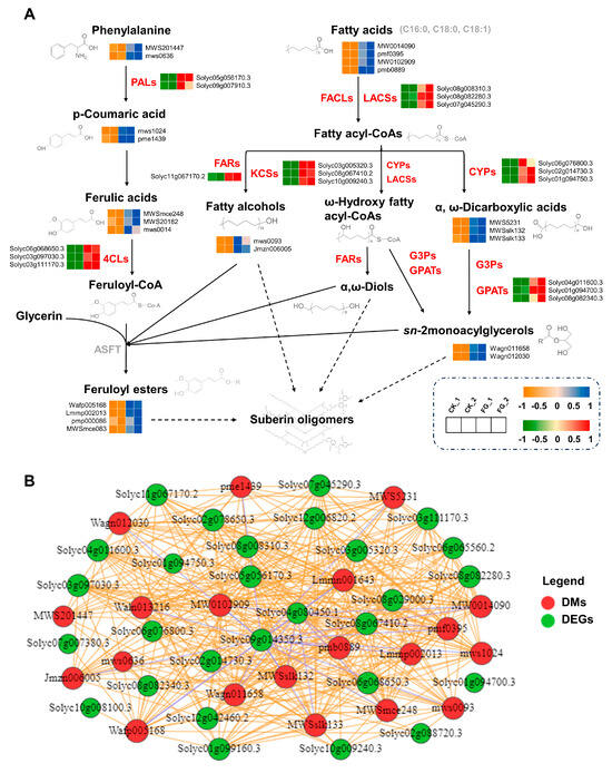 Analysis of suberin biosynthesis pathway and metabolic network. (A) Schematic of suberin biosynthesis pathway. Differentially expressed genes and metabolites are marked next to related enzymes or products in the form of a heat map. The color scale represents the values of the log2 ratio (FG/CK), with metabolites ranging from orange (low) to blue (high) and genes ranging from green (low) to red (high). (B) The connection network of suberin metabolism-related genes and metabolites. Red circles represent differential metabolites (DMs), while green circles represent differentially expressed genes (DEGs). Yellow lines indicate positive correlations and blue lines indicate negative correlations.
