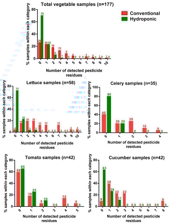 Percentage of samples (%) according to the number of detected pesticide residues for conventional and hydroponic vegetables.