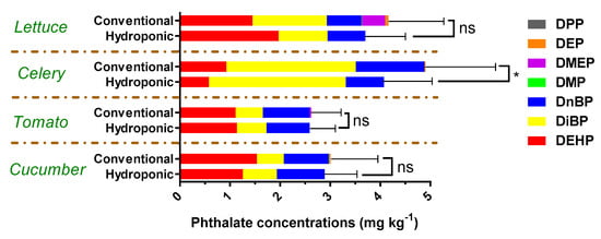 Concentrations of DEPH, DEP, DiBP, DMEP, DMP, DnBP, DPP, and ΣPAEs in conventional and hydroponic vegetables. Values represent means ± SDs, * p < 0.05. Statistical significance was assessed with t-tests.