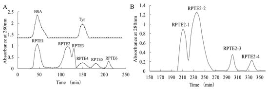 Gel filtration chromatography, a widely employed technique for separating bioactive substances based on molecular size, has been instrumental in purifying components from protein hydrolysates and removing impurities such as salts or buffer exchange [16,36,37,38]. In our study, we initially purified the hydrolysate RPTE using Sephadex G-25 chromatography. Concurrently, bovine serum albumin (66.4 kDa) and tyrosine (181.2 Da) were eluted from the column to serve as reference points. As Figure 1A depicts, six distinct fractions (RPTE1-RPTE6) were obtained from the RPTE hydrolysate. Based on molecular weight considerations, RPTE1 likely contained molecules larger than 50 kDa, while RPTE5 and RPTE6 were likely composed of small amino acids (<200 Da). It is noteworthy that peptides within the molecular size range of 0.5–3 kDa are often attributed to significant antioxidant activity in protein hydrolysates [19,39,40].