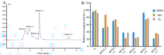 The free radical scavenging activities of these fractions against DPPH•, hydroxyl radical (HO•), and superoxide anion radical (O2) were assessed individually [28]. The fraction exhibiting the most potent antioxidative activities was subjected to further purification using a Sephadex G-15 gel filtration column (2.6 × 60 cm, Ruji Technology Development Co., Shanghai, China). Elution was performed with distilled water at a flow rate of 1.25 mL/min. The fractions (RPTE2-1–RPTE2-4) were combined and lyophilized. Based on the same free radical scavenging assays, the fraction demonstrating the strongest antioxidant activity was selected for additional purification steps.